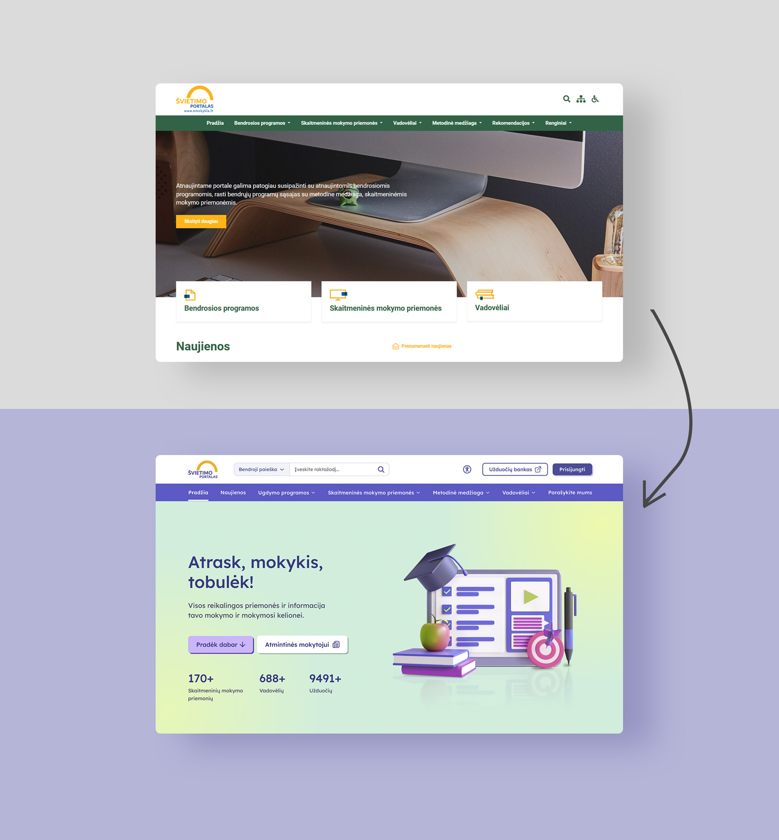 Nors pagrindinė Švietimo portalo interneto svetainė jau egzistavo, jai reikėjo esminių pokyčių. Informaciją buvo sunku rasti, vizualinis identitetas buvo pasenęs, o patirtis neatspindėjo besikeičiančių naudotojų poreikių. Taip pat ji nebuvo paruošta susieti su naujaja SMP platforma.